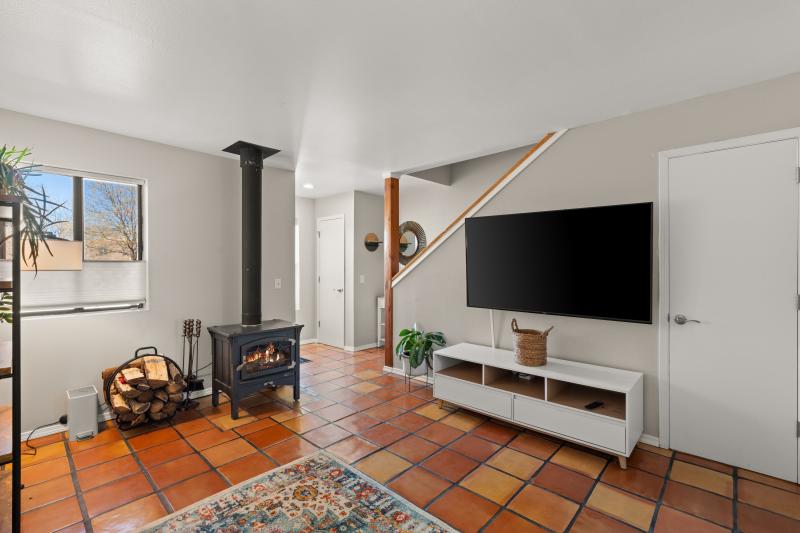 SOLD: Absolutely darling two bedroom, one and a half bath attached Townhome located in Central Santa Fe. Move in condition, the Seller has updated flooring, baths, kitchen with decorator level upgrades. All new appliances in 2021, all carpet removed and replaced with wood or tile flooring, upgraded light fixtures throughout, evap cooling, new window treatments, and a efficient wood burning stove in living area make this property cozy and welcoming. A lovely, fully fenced yard off the kitchen faces East for a great place to BBQ, garden, and relax. Upstairs bedrooms are sunny and bright, washer/dryer, storage, and guest bath located off kitchen area downstairs. Low HOA fees, easy access to Central Santa Fe commercial businesses, and a full service well maintained park across the street. Sunny deck off upstairs bedroom faces West. MLS 202500777 $299,500.00