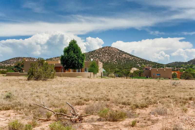 SOLD! Lovely property on the edge of town, just off Old Santa Fe Trail. Tucked down a short lane, the house boasts incredible views of the Jemez Mountains and nearby hillsides, fully fenced-in grounds, and beautiful landscaping. Multi-level layout, open living area has large windows, vigas & split cedar ceilings, french doors open to a large view deck and the landscaped patio.