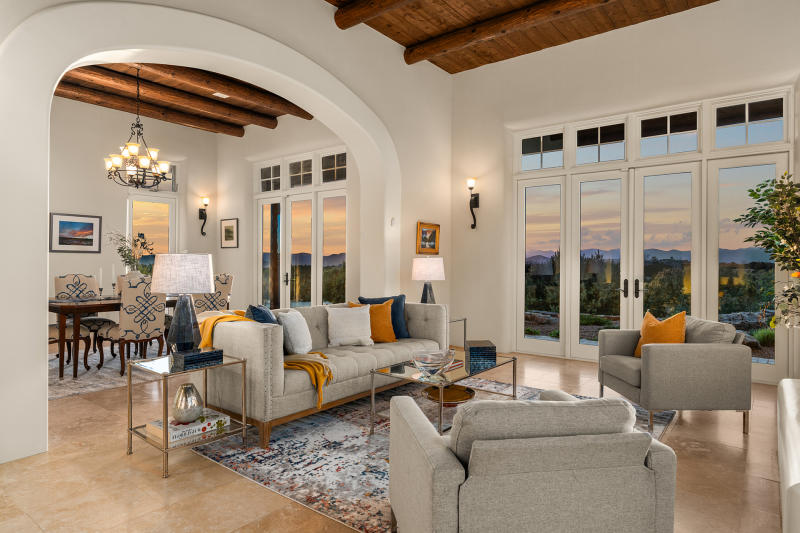 SOLD! Simply Beautiful Southwest Contemporary with Italianate Flair located in Las Campanas. Travertine tiles throughout, spacious living areas, formal dining space, beautifully crafted features such as rounded doorways, high ceilings with T & G, wood accents, and beams in many rooms. The high ceilings and clerestory windows bring Natural light into the living and dining rooms, single level (no stairs anywhere in the house). A recent addition of a wall along the curving driveway creates spacious, enclosed front & side yards and adds privacy, areas to garden and relax to take in the views.MLS #202401069 $1,785,000.00